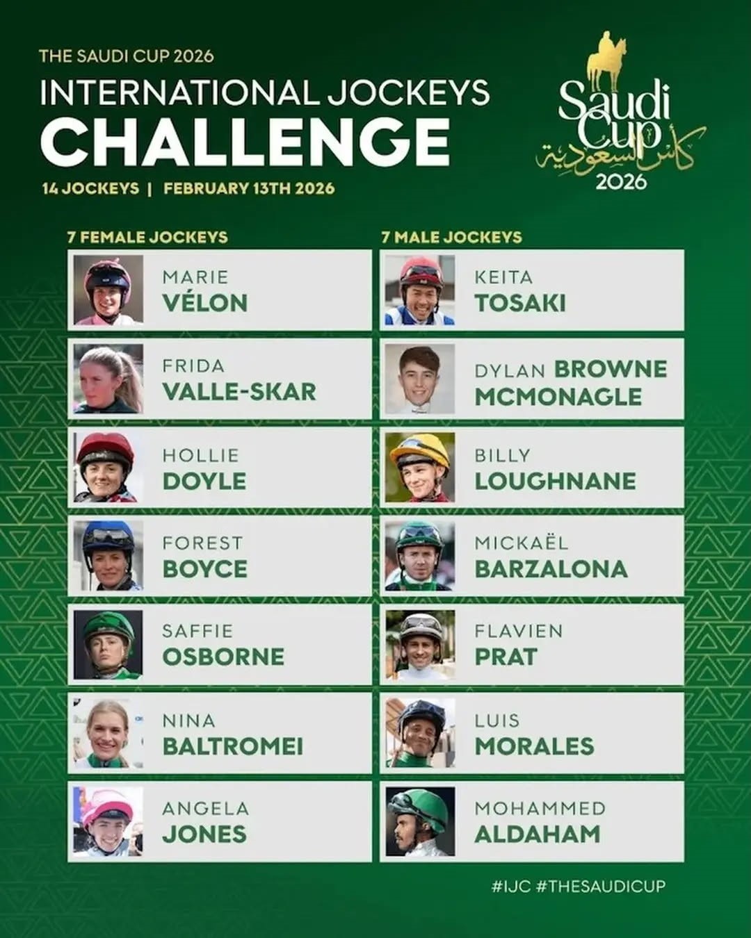 Syv kvinner og syv menn kjemper om penger og prestisjetunge plasseringer på King Abdulaziz Racecourse i Riyadh. Fire løp skal ris, det er for øvrig den eneste store jockeymatchen med likt antall kvinnelige og mannlige ryttere i startboksene. Begivenheten er stor, og navnene enda større: